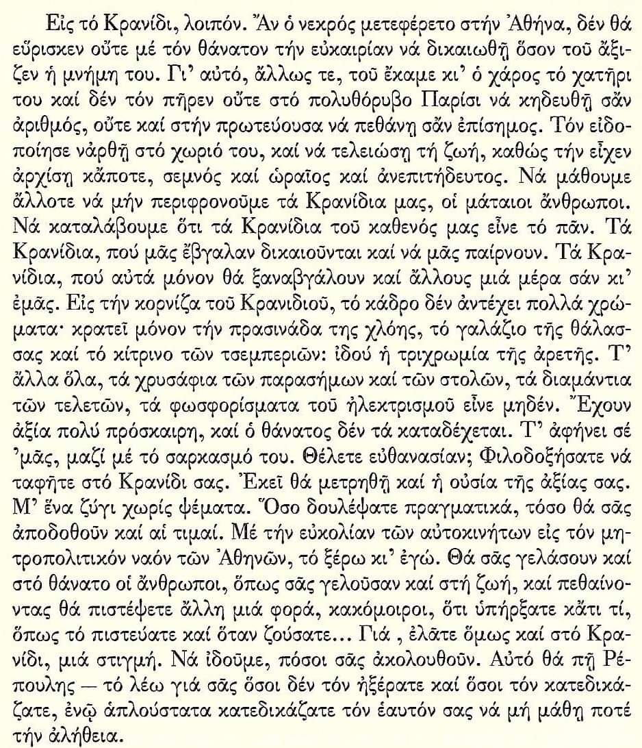 Το άρθρο αυτό που δημοσιεύθηκε στο “Ελεύθερο Βήμα” στις 17 Μαϊου 1924 το συμπεριλαμβάνεται στο βιβλίο “ΕΜΜΑΝΟΥΗΛ ΡΕΠΟΥΛΗΣ” (Επιστολές ,άρθρα, ομιλίες) το οποίο εκδώθηκε από τον Δήμο Κρανιδίου το 2001.